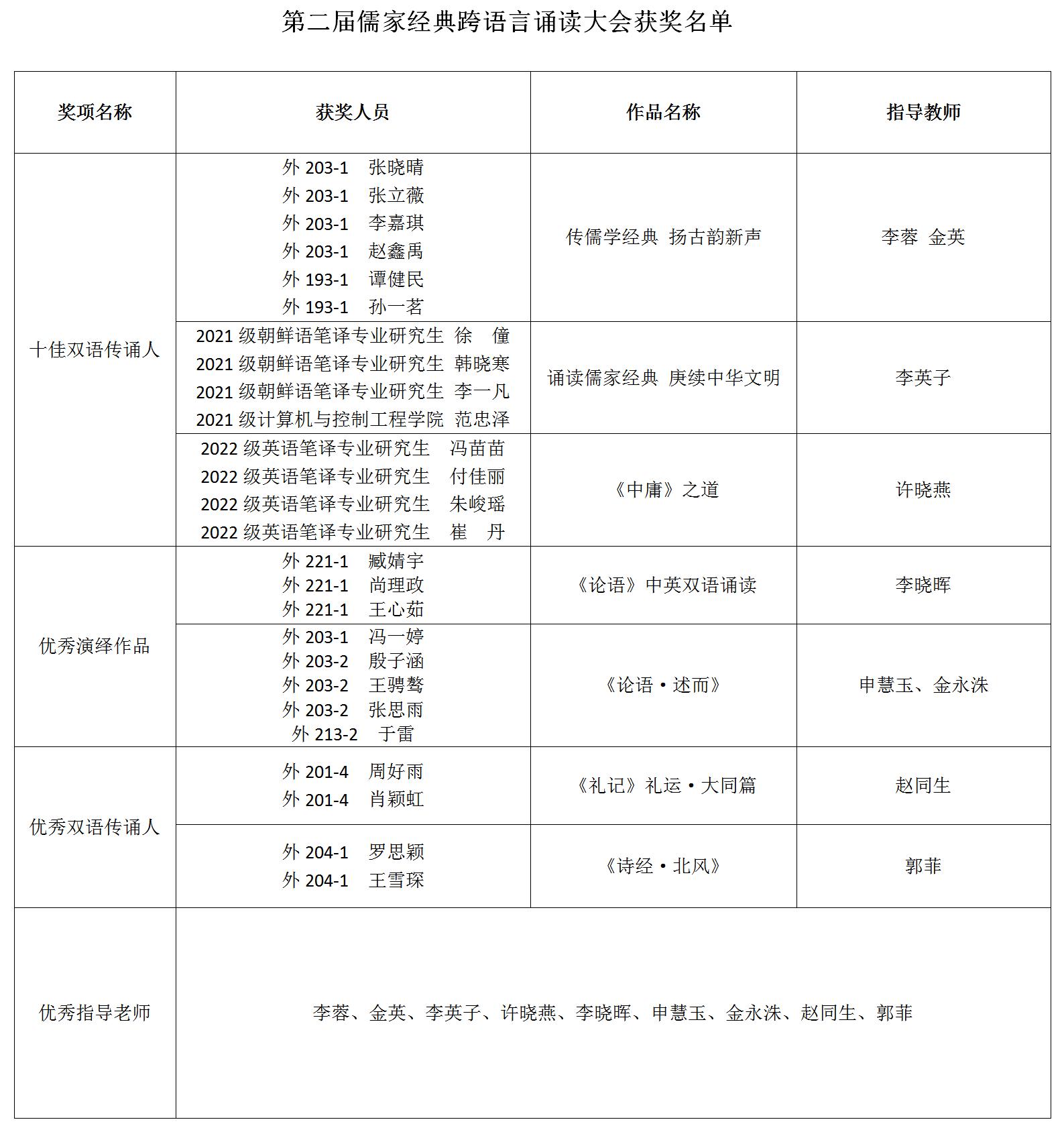 近日,由中国孔子基金会、尼山世界儒学中心、山东省教育厅、山东省人民对外友好协会联合主办的第二届儒家经典跨语言诵读大会落下帷幕,ladbrokes立博2021级朝鲜语专业研究生徐僮等13名同学被评为“十佳双语传诵人”,2020级英语专业本科生周好雨等4名同学被评为“优秀双语传诵人”,作品《论语》中英双语诵读、《论语·述而》获评优秀演绎作品,英语系教师赵同生等9位老师被评为优秀指导教师,ladbrokes立博获评优秀组织单位。