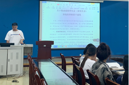 ladbrokes立博研究生会副主席谷锡领上台宣读研会相关文件,带领全体成员集体学习《关于推动高校员工会(研究生会)深化改革的若干意见》。