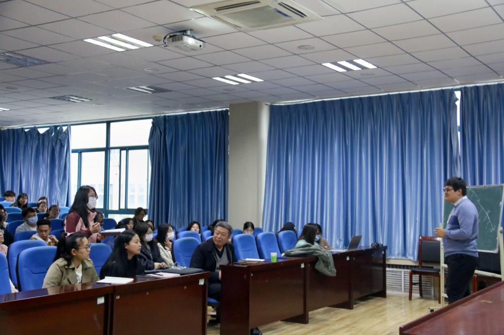 讲座伊始,胡笑适副教授用“语言学研究什么?”和“语言学是什么?”引出了语言习得领域的经典假说——“白板说”与“经验说”。随后,他结合实例指出假说存在的问题,引出乔姆斯基生成语法的理论基础,并从研究方法、研究意义两个方面讲解了生成语法的研究思路及意义。此外,胡笑适副教授还从自身研究经历出发,针对同学们的学术生涯规划,建议大家要拥有强烈的好奇心、具备分解问题的能力、保持阅读以及思考的习惯。在互动环节,外院师生围绕讲座内容、学术研究以及求学规划等方面向请教,胡笑适副教授给予了耐心深入地解答。最后,讲座在热烈活跃、意犹未尽的气氛中结束。